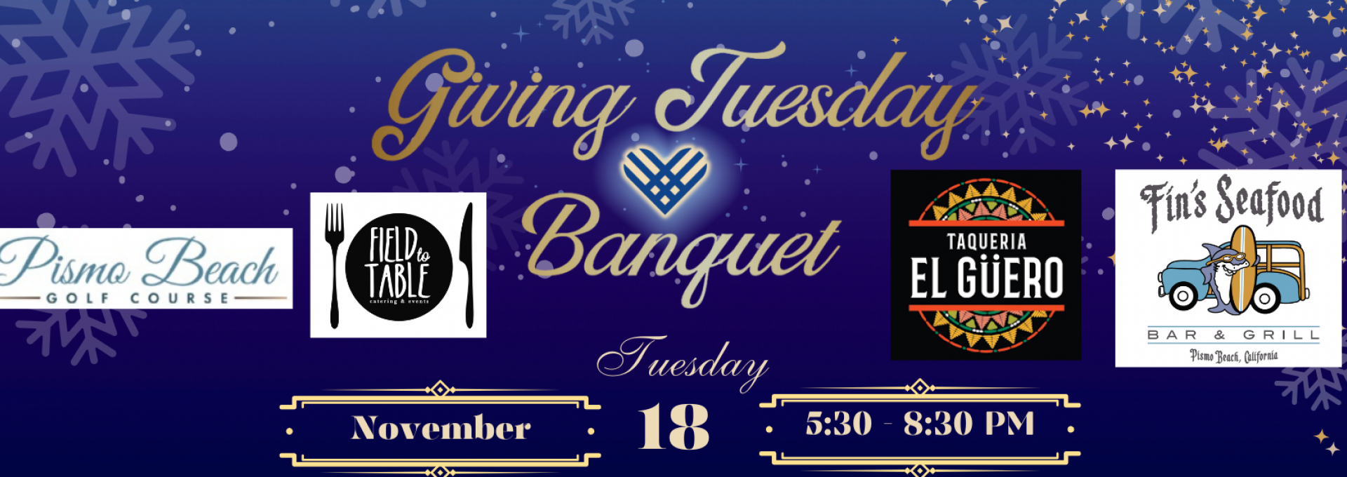 Come celebrate Giving Tuesday, November 18, 2025, with “Dinner for a Cause” Banquet in the tent at Pismo Beach Golf Course, 9 Le Sage Dr, Grover Beach, CA 93433. From 5:30 pm to 8:30 pm, there will be dinner, dancing and so many ways to support! 100% of all proceeds benefit the 5Cities Homeless Coalition. Seats are limited and tickets must be purchased in advance of this lovely, seated event.